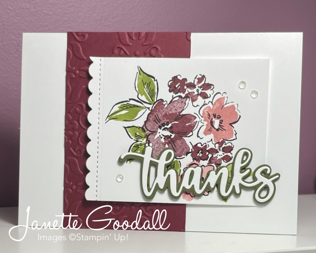 Most of my stamps are of flowers because I love them, and I love two-step stamping. This one is especially easy to use, as it doesn’t matter if it doesn’t exactly match up, it still looks great. I used an old Stampin’ Up! quatrefoil embossing folder on the Merry Merlot card to give some texture to the design.