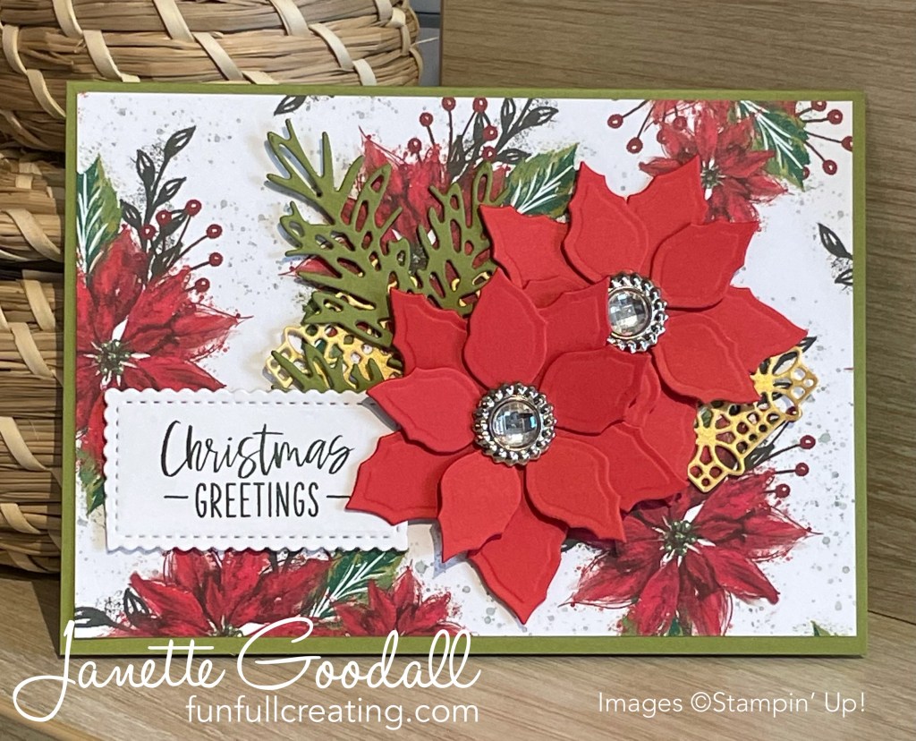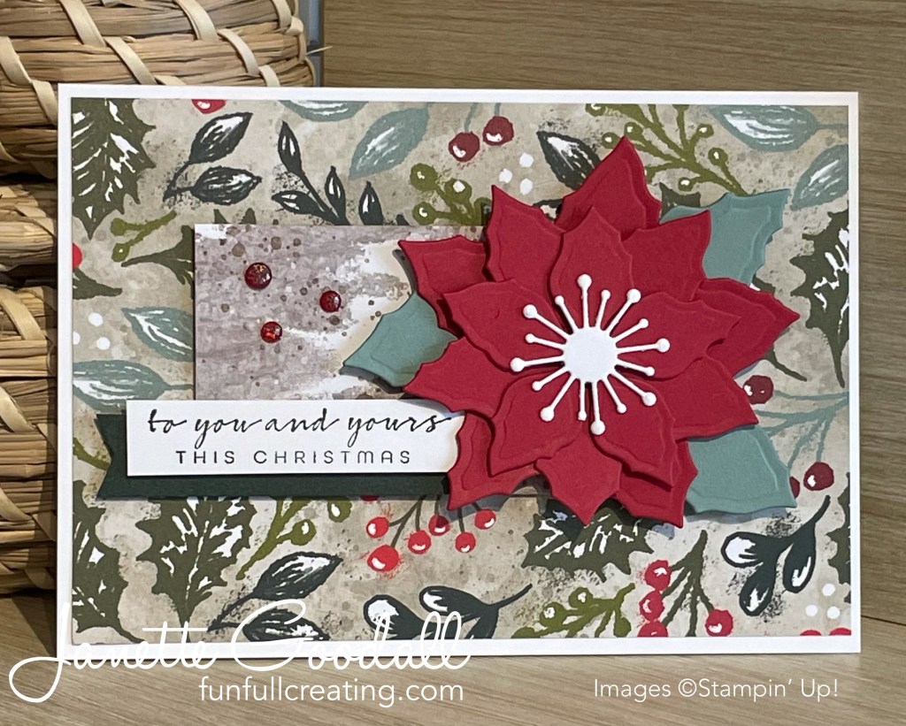 I have started making Christmas cards! I really do enjoy making cards that are so bright and colourful and bring joy to people, including myself. The papers are from Stampin’ Up!’s Boughs of Holly Designer Series Paper which I am really enjoying playing with. I am calling this my “Poinsettia Collection”. The poinsettia dies are by Lady E.