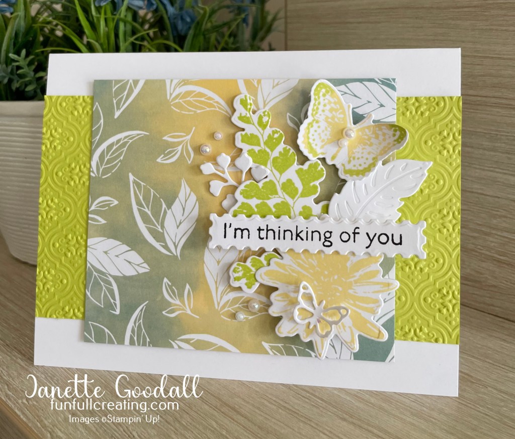 I used the sketch as my starting point, used the Stampin’ Up! Lemon Lime Twist cardstock which I embossed, and stamped the foliage in Lemon Lime Twist and Lemon Lolly.