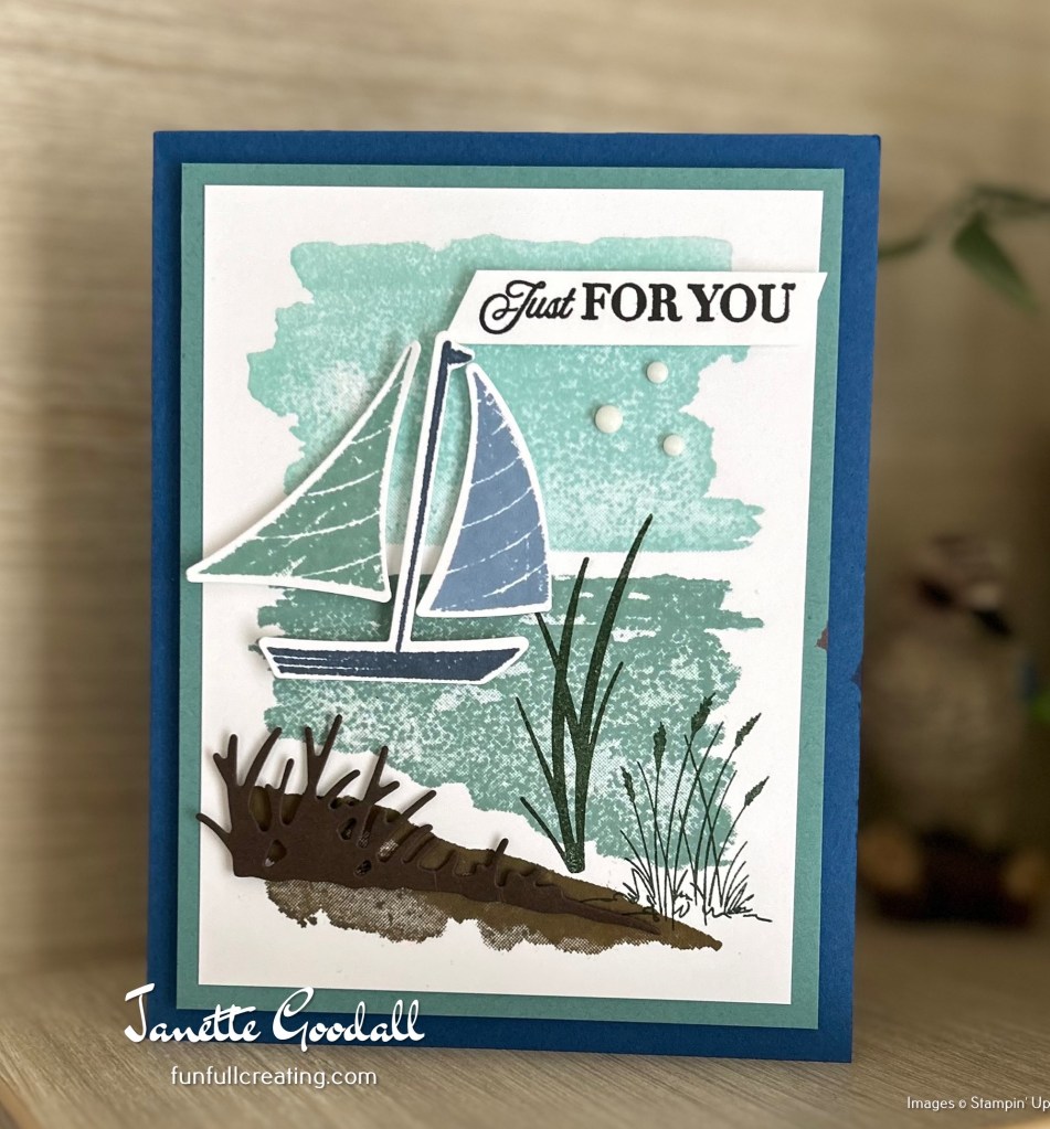 I chose to use my yacht punch and add it to a scene I created using the Oceanfront stamps from Stamping’ Up! which I’ve had for a couple of years.