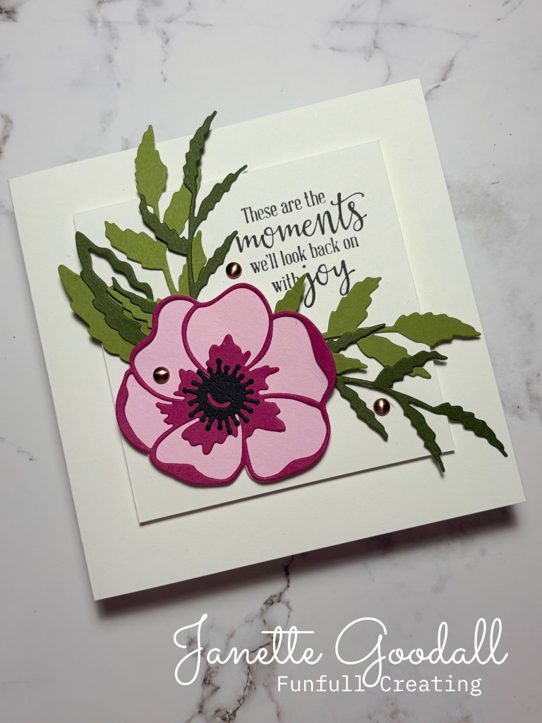 I chose a very old and much loved stamp set for this card and used the dies for the flowers. I used Old Olive and Mossy Meadow for the 2 greens, and Bubble Bath and Berry Burst for the 2 pinks.