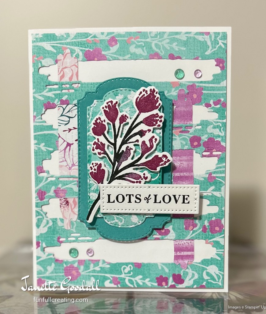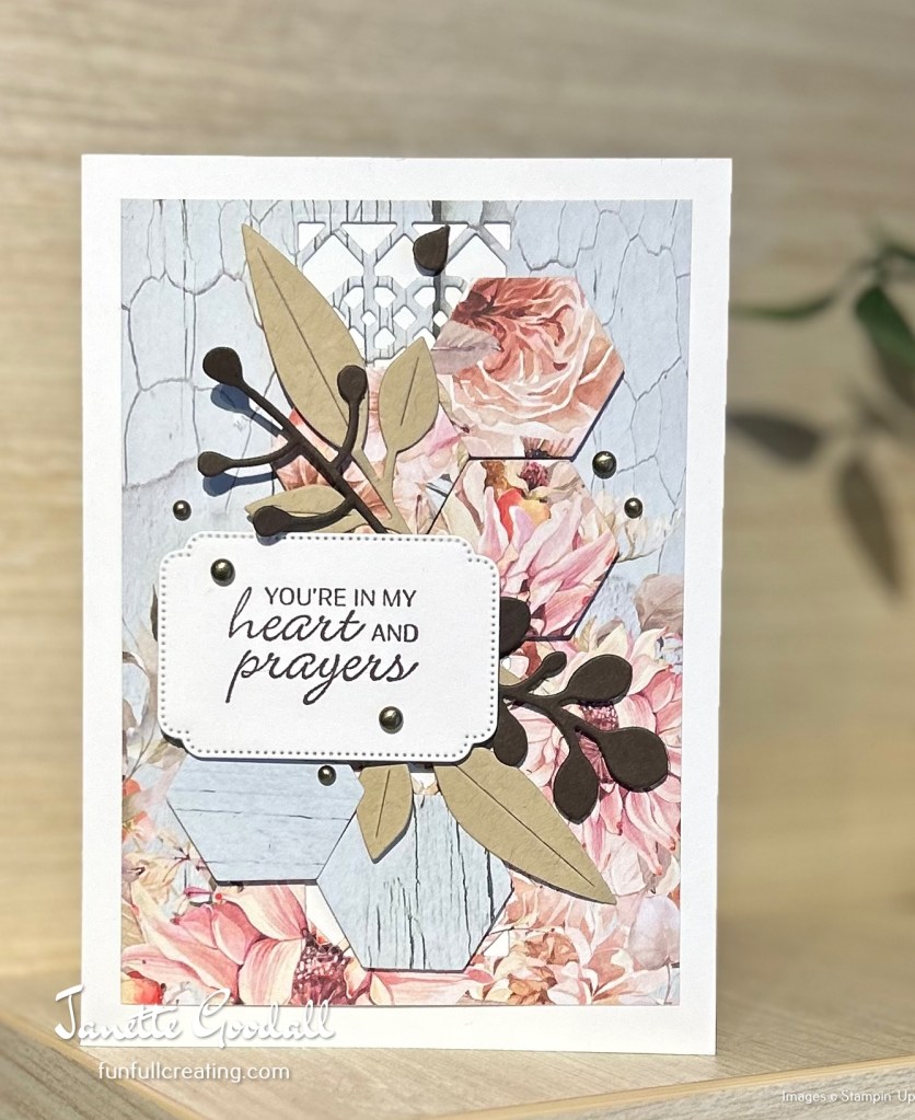 I loved making this card and when I chose the paper which has flowers at the bottom and blue at the top, I got the idea to cut the hexagon shapes in the blue and some in the flowers and alternate them on the card. I love how it brings it all together.
