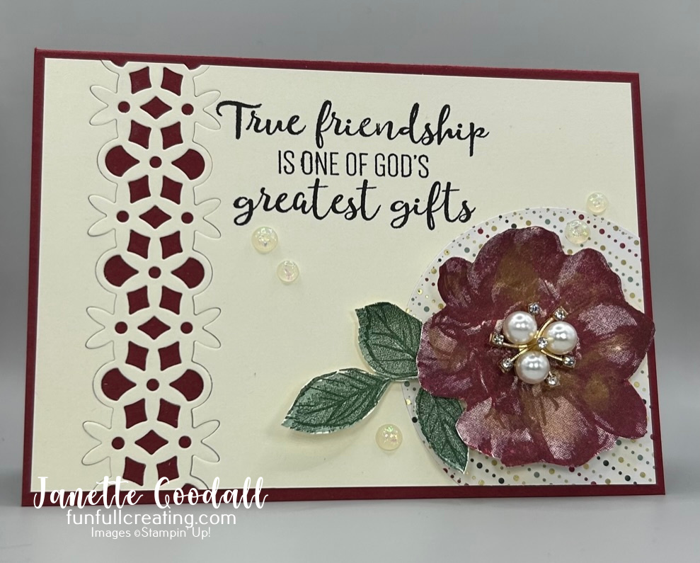 Back again with a challenge with Sketch Saturday, this week it is #732. I used the Stampin’ Up! stamp set To A Wild Rose and added Simon Hurley’s Gold Lunar Paste to the rose with a thin brush.
