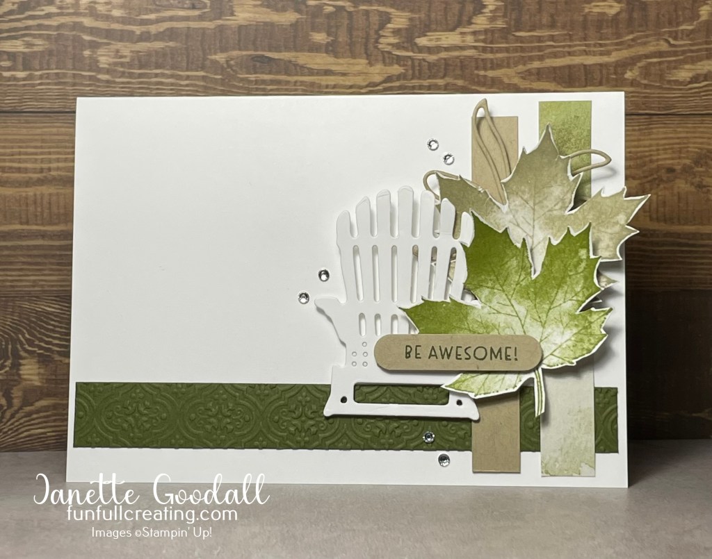 I used the sketch as my starting point, used the Stampin’ Up! Lemon Lime Twist cardstock which I embossed, and stamped the foliage in Lemon Lime Twist and Lemon Lolly.