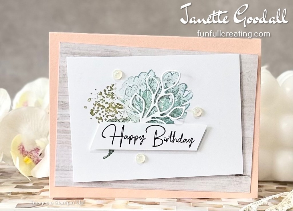 My card features a wood grain mat with a second mat of a floral arrangement, a Happy Birthday greeting, and 3 glass-like beads. It is a very simple card to make and has a classic feel I think.