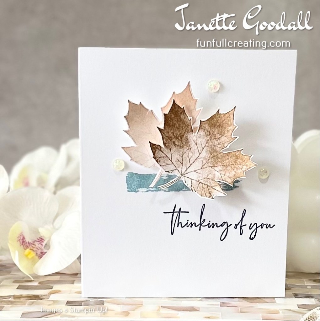 I chose to layer two leaves and add a die-cut leaf in the centre and three glass-like dew drops.