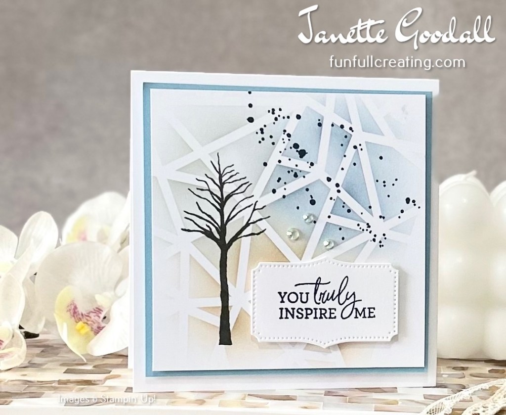 The card I entered into this challenge is sponged using those four colours and an abstract stencil. I was surprised at how well the colours go together and made several other cards using this colour combination. I muted the colours in this card as I wanted the tree to stand out.